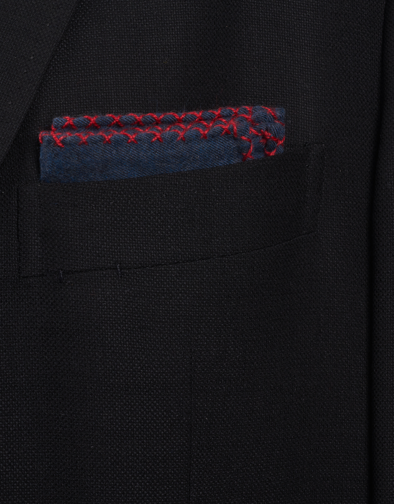 Navy Flannel Pocket Sq with Hand-made cross stitch Red border